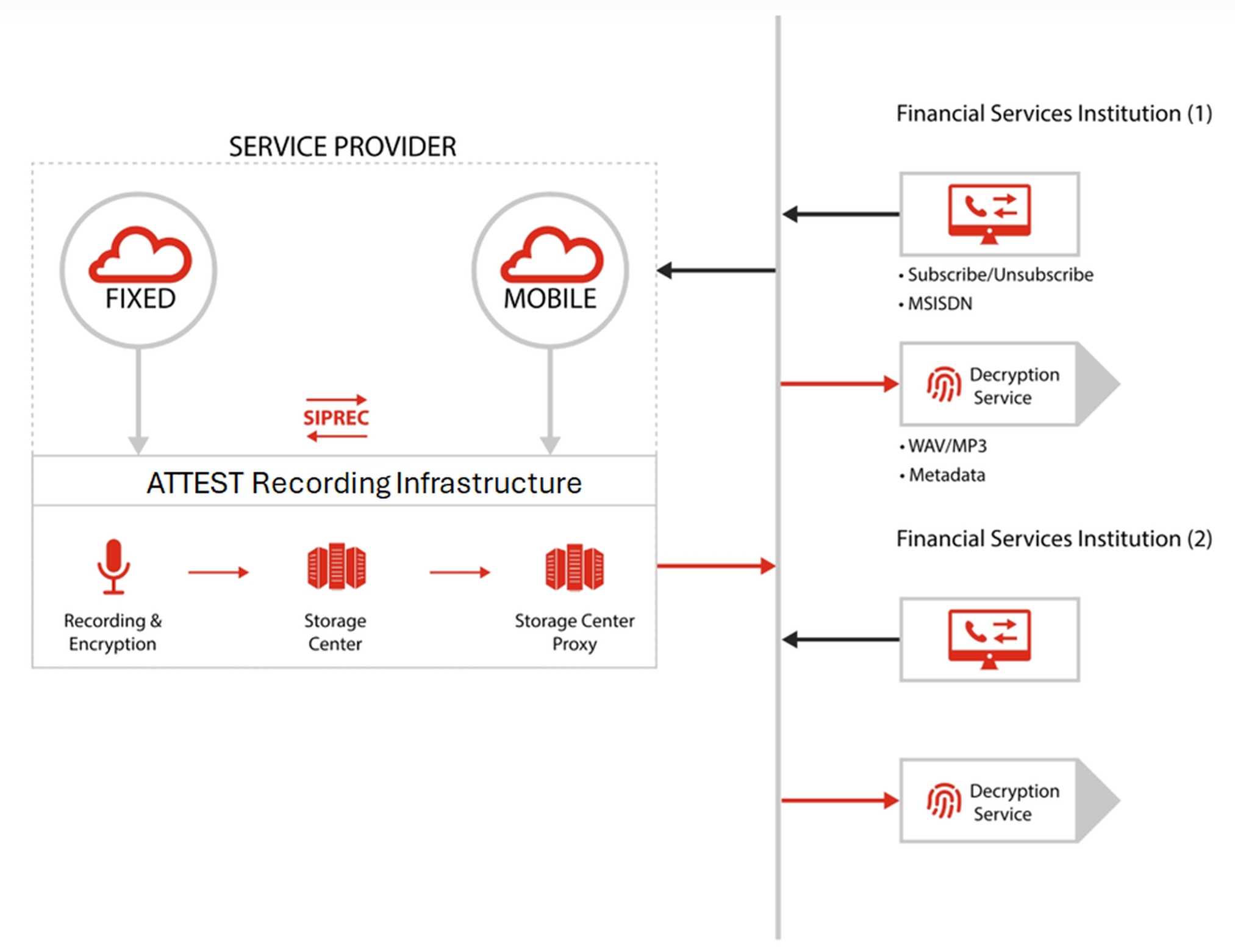 ATTEST is a 4th generation cloud-based solution which can be installed in the Core Network of the both Mobile and Fixed Line Operators. Financial firms can take Call Recording as a Service from the Network Operator without requiring the swapping of SIM cards, installing special Apps, or investing in non-compliant fixed/mobile integrations. Additionally, as ATTEST is deployed directly in the network, the entire call is recorded without call clipping.